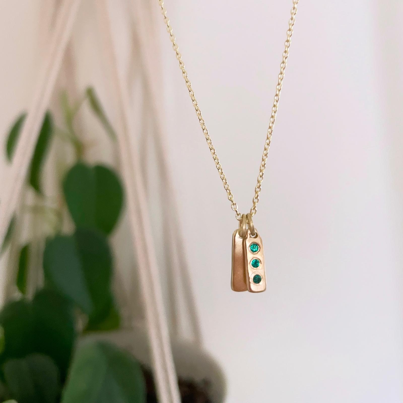 שני תליונים מלבניים הנעים זה לצד זה ועשויים בעבודת יד מזהב צהוב 14k.